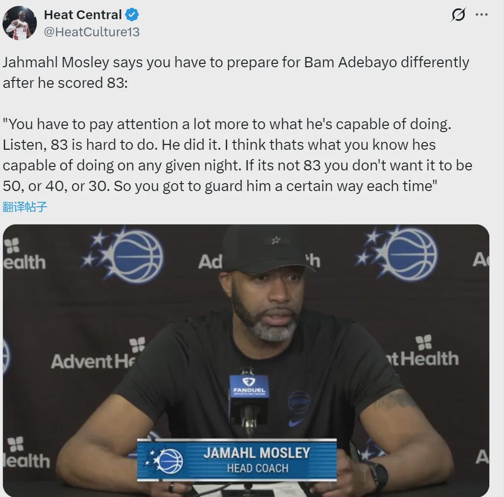 魔术主帅莫斯利赛后接受采访时说道:“阿德巴约任何一晚都可能爆发!就算不是83分,你也不想让他拿50分、40分或者30分。所以,我们每次都必须用特定的方式去防守他。”阿德巴约赛后对裁判不满:“他们的吹罚改变了比赛走势。”
